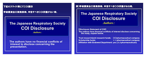 発表ではひな形(ppt)に準じたスライドを呈した上で利益相反状態の有無を述べてください。